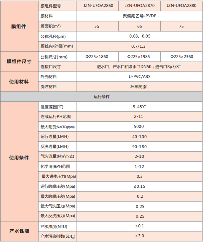 金泽能压力式组件采用先进的膜分离法制备的PVDF中空纤维超滤膜, 均质海绵体结构,具有大通量、长寿命、耐药性、抗污染等特点。外压式组件结构可应用于死端或错流运行方式。JZN-UFOA2880 组件是目前市场上单支膜面积大组件之一,可承受更宽泛的进水水质的同时保障高产水量。JZN-UFOA2880 组件已广泛用于市政饮用水净化和污水处理、工业废水处理和中水回用、海水淡化等领域。